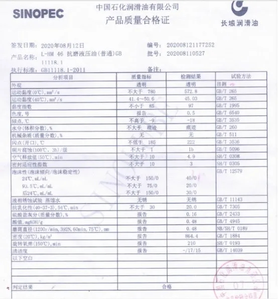 參考上述產(chǎn)品合格證中40°C粘度指數(shù)為45.03,可證明液壓油的此項(xiàng)指標(biāo)是符合標(biāo)準(zhǔn)的。