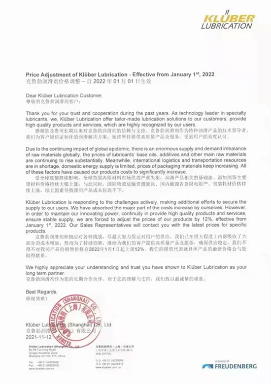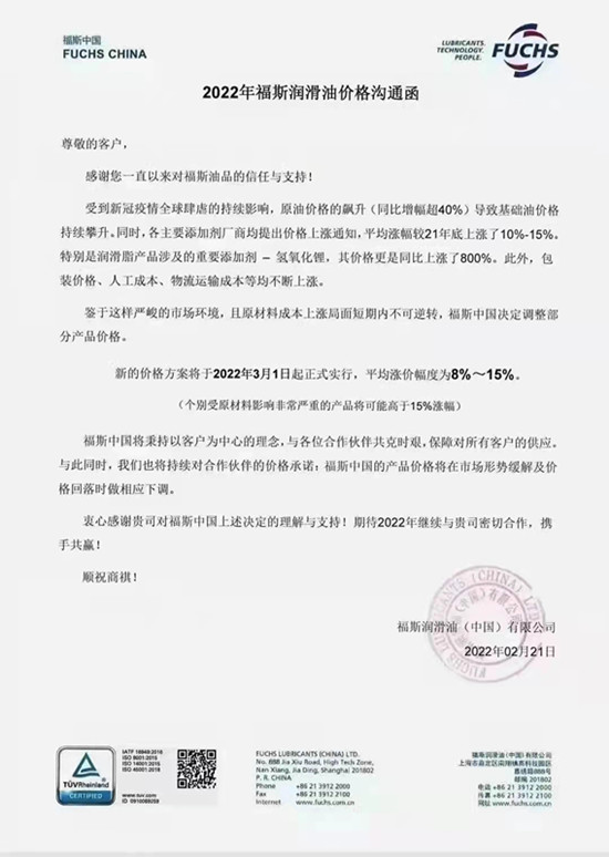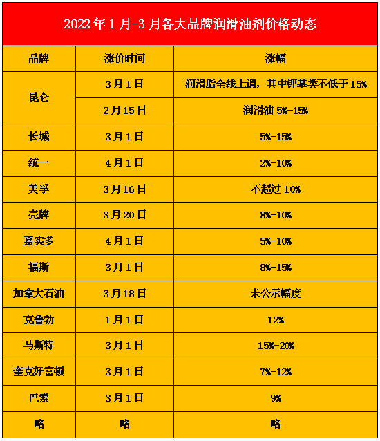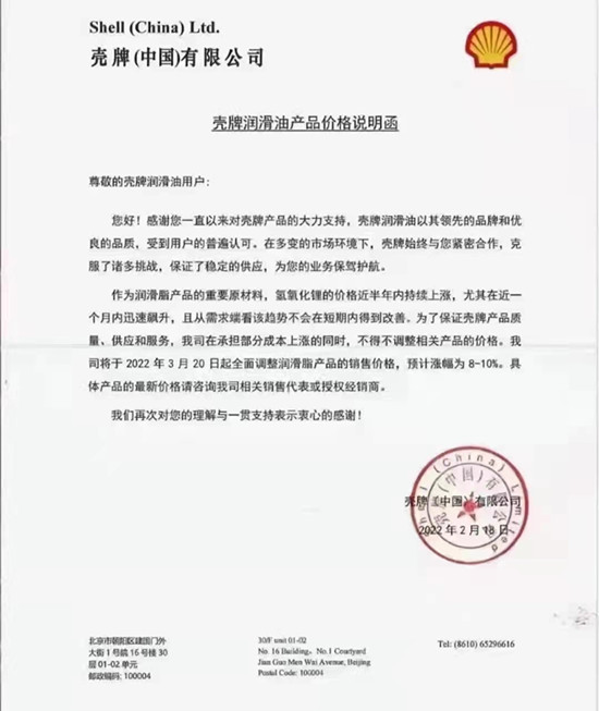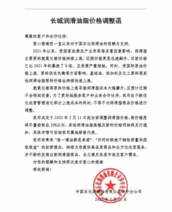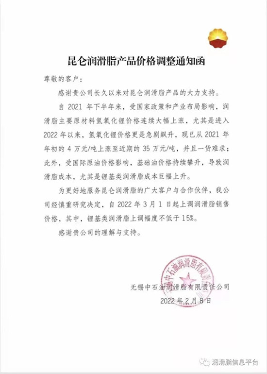 跟原油價格休戚相關(guān)的潤滑油產(chǎn)業(yè),油料這邊迫于基礎(chǔ)油和添加劑的成本上漲10-15%、潤滑脂的主要原材料氫氧化鋰)從2021年的4萬元/噸飆升到40萬元/噸,國際國內(nèi)所有潤滑油品牌不約而同調(diào)整了出廠價。