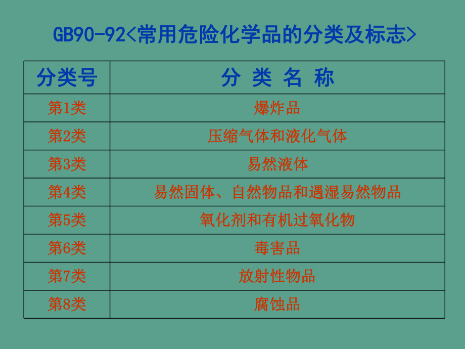 常用危險化學(xué)品在《常用危險化學(xué)品的分類及標(biāo)志(GB 13690-92)》中按危險特性分為8類:(順序和危險等級沒有關(guān)系)