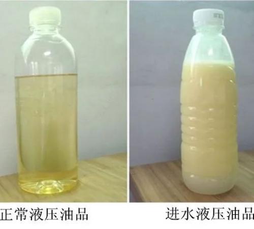 液壓油和水不相溶,且油的密度比水小,當(dāng)油水混合時在溫度、振動、壓力等的作用下,互相包裹形成無數(shù)的微小分隔面,在光的折射作用下顯現(xiàn)白色,肉眼觀察呈奶白色。