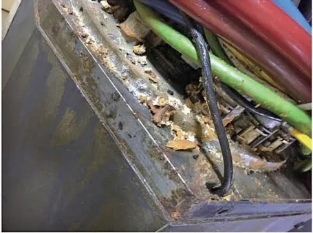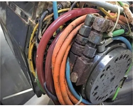 設(shè)備廠家維修拆開主軸內(nèi)部發(fā)現(xiàn),各種電氣管線都附著一些黃褐色物質(zhì),金屬表面已出現(xiàn)銹蝕現(xiàn)象,部分電氣管線外層膠皮已腐蝕硬化脫落,個(gè)別管線內(nèi)部已進(jìn)入切削液,故障分析之后發(fā)現(xiàn)與切削液有關(guān)。因?yàn)橹鬏S管線內(nèi)部結(jié)構(gòu)復(fù)雜且腐蝕程度已造成故障隱患,需要對管線整體進(jìn)行更換,但機(jī)床配件進(jìn)口周期較長,造成長時(shí)間停機(jī)維修,損失較大。