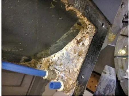原因二,車間劃線工序?yàn)榱嗽诠ぜ鲃澇銮逦木€條,一直在毛坯表面涂一層白色石灰水,長時(shí)間的應(yīng)用使得大量石灰水混合在切削液內(nèi),切削液硬度升高,導(dǎo)致切削液皂析出,造成機(jī)床密封處積有附著力很強(qiáng)且較難去除的結(jié)垢物質(zhì),致使機(jī)床密封性能下降。