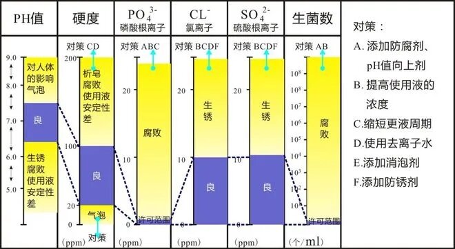 當(dāng)pH值<8.5時,同時切削液還有異味,這時需要立即進(jìn)行殺菌處理,查明原因并制定合理的解決方案。